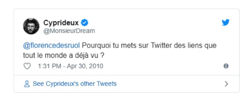 Florence Desruol était un personnage presque central de Twitter en 2010–2012 : elle pouvait reprocher aux autres utilisateurs de lui “voler” des liens, de ne pas la citer, et était au centre d’une suspicion généralisée sur la provenance de ses followers. Certains allant jusqu’à se moquer de son état mental.