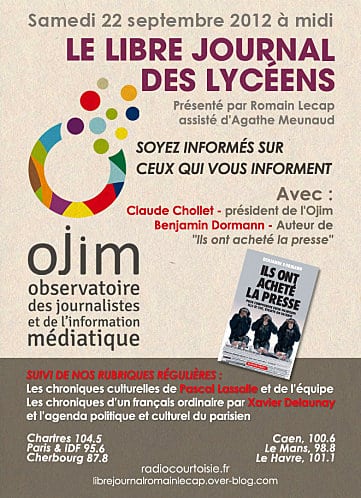 Claude Chollet, président de l’Ojim, était invité sur Radio Courtoisie le samedi 22 septembre au “Libre Journal des Lycéens”, animé par Romain Lecap, en compagnie de Benjamin Dormann (auteur de “Ils ont acheté la presse”), dans un émission intitulée “Soyez informé sur ceux qui vous informent”. L’émission est disponible à l’écoute ci-dessous.