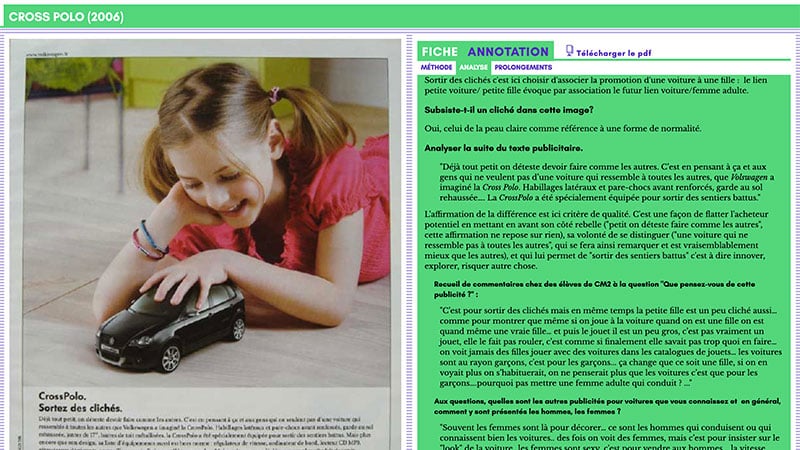 Comme dans les catalogues de jouets, il est rare de voir associées une voiture et une petite fille ; même si l’image se veut rassurante (le goût pour les voitures ne nuit pas à la féminité de l’enfant), elle a au moins le mérite d’échapper à l’association classique voiture et femme-objet. On aimerait toutefois voir cette publicité, qui se targue de sortir des clichés, nous présenter une voiture de taille réelle et une femme la conduisant. Il est bon de rappeler qu’il y a autant de femmes que d’hommes qui passent leur permis de conduire chaque année, qu’il y a de nombreuses conductrices de bus, de poids lourds, de grues, d’avions de chasse, etc… Conduire est une pratique qui s’apprend et non une prédisposition génétique. »