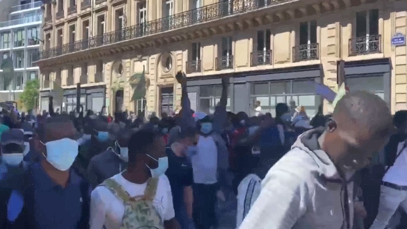 « L’appel à cette “marche des solidarités”, pour demander une régularisation des sans-papiers et une révision de la politique migratoire française a été relayé par près de 210 organisations et 300 personnalités, selon un texte diffusé sur les réseaux sociaux ». La seule infraction commise par les manifestants mentionnée par la radio d’Etat est la participation à une manifestation interdite.