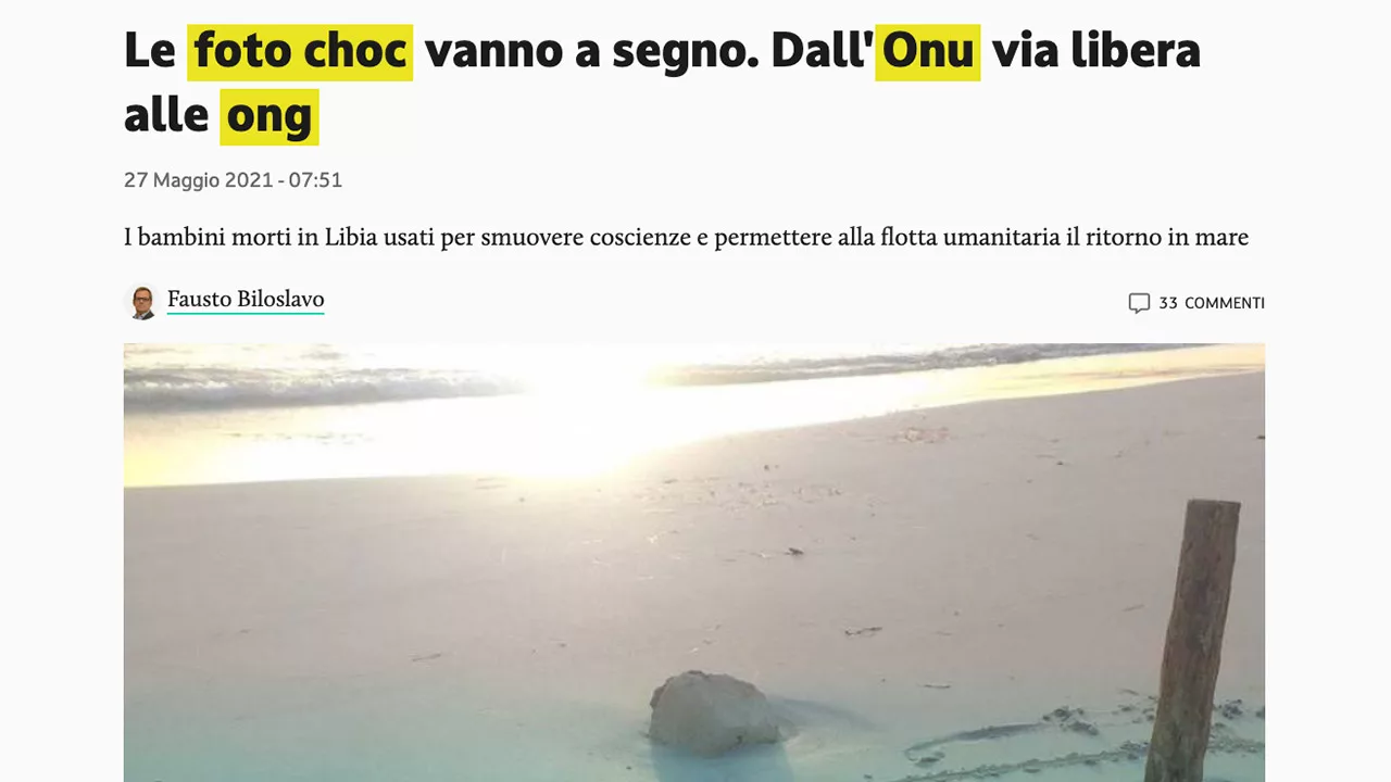 Les seuls vrais coupables des enfants sans vie, le visage dans le sable, sont les trafiquants, qui envoient les migrants sur leurs radeaux de la mort en Italie contre rémunération. Des ONG, comme Open Arms, qui grâce à son fondateur Oscar Camps ont lancé des images choquantes, préfèrent pointer du doigt notre pays et l’Europe qui, selon elles, ont abandonné le sauvetage en mer. Le résultat évident est que pour éviter des drames, la flotte humanitaire doit s’en occuper en débarquant des migrants en Italie (…). Le moment du coup de poing photographique dans l’estomac n’est également jamais choisi au hasard. Les dernières photos sortent à l’occasion du sommet des chefs de gouvernement de l’UE, qui devait aborder la question de l’urgence des migrants. De plus, les navires des ONG, comme l’Open Arms, sont ralentis par des arrêts et des contrôles administratifs. Et bientôt le Parlement devra voter pour renouveler, ou non, les missions en Libye dont le soutien aux garde-côtes qui ont ramené plus de 9 000 migrants depuis janvier. Et aussi les Nations Unies, avec le Haut-Commissariat aux droits de l’homme, demandent à la Libye et à l’UE de modifier les opérations de recherche et de sauvetage en Méditerranée.