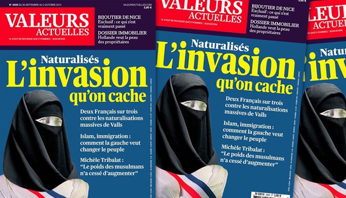 Cette couverture de septembre 2013 représentait une Marianne portant le voile accompagnée du titre : « Naturalisés : l’invasion qu’on cache. » D’autres titres indiquaient « Islam, immigration: comment la gauche veut changer le peuple » ou encore « Le poids des musulmans n’a cessé d’augmenter ».