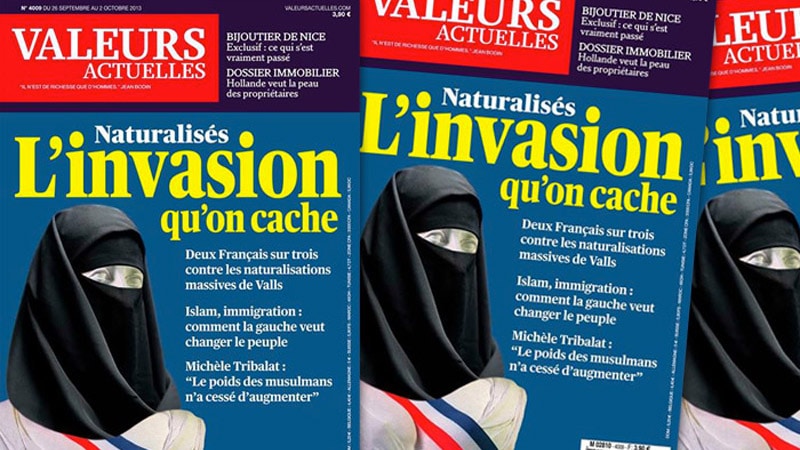 Yves de Kerdrel, le directeur de la publication de l’hebdomadaire, a été condamné à une amende de 2 000 euros pour « provocation à la discrimination envers les musulmans ». En février 2013, Valeurs Actuelles avait fait sa une sur les « Naturalisés : l’invasion qu’on cache », représentant pour l’occasion une Marianne voilée sur la couverture.