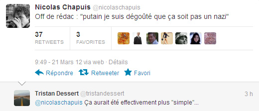 Nicolas Chapuis, journaliste : « Putain ! Je suis dégoûté que ce ne soit pas un nazi ! » Le tweet a depuis été supprimé par son auteur.
