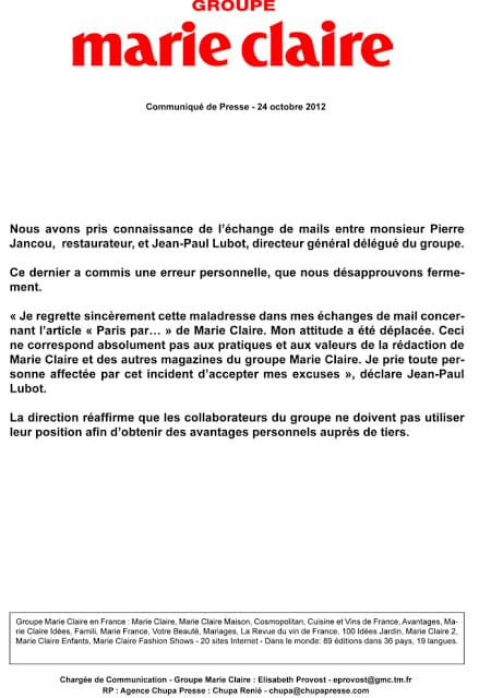 Je n’ai jamais dit que j’étais journaliste gastro. Je suis l’éditeur de M Claire et DG du groupe (90 mags dans 35 pays). Tous les mois, nous faisons un “Paris by un membre de MC. Et c’est dans ce cadre qu’est intervenue notre démarche. Vous avez le droit de refuser sans être odieux.