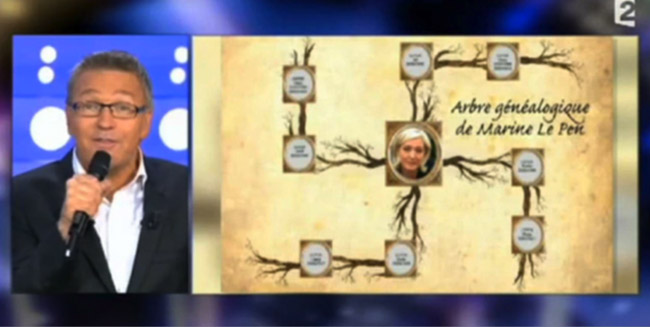 Pour mémoire, rappelons qu’en novembre 2011, l’animateur Laurent Ruquier avait exhibé dans son émission « On n’est pas couché » deux dessins de Charlie Hebdo. L’un représentait l’arbre généalogique de Marine Le Pen sous la forme d’une croix gammée avec le visage de la présidente du Front national au centre ; l’autre représentant une affiche de campagne avec un étron fumant et la légende : « Marine Le Pen, la candidate qui vous ressemble ».