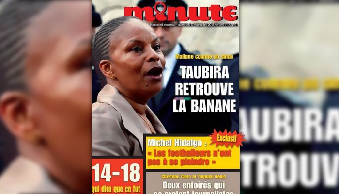 Jeudi 30 octobre, le directeur du journal Minute, Jean-Marie Molitor, a été condamné à 10 000 euros d’amende pour la couverture du 13 novembre 2013 qui titillait la garde des Sceaux : « Maligne comme un singe, Taubira retrouve la banane. »