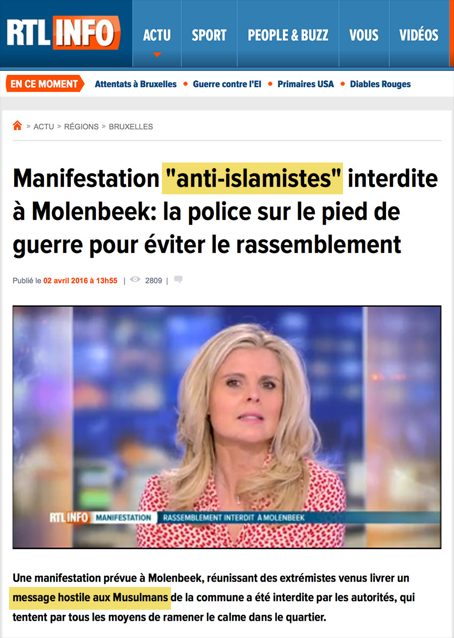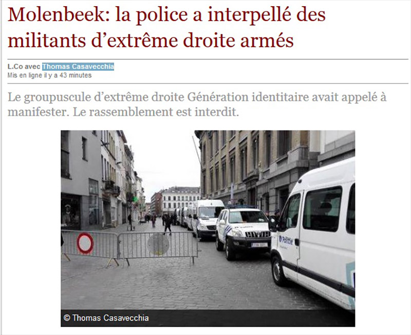 Très peu de manifestants étaient en réalité présents sur place. Ceux qui y étaient ont très vite été interpelés par la police et la machine à désinformer s’est mise à tourner à plein régime : « Molenbeek: la police a interpellé des militants d’extrême droite armés », titrait Le Soir. Quand RTL Info titrait : « Molenbeek : la police interpelle des militants d’extrême droite en marge de la manifestation interdite ». En lisant l’article, on apprenait que les militants étaient au nombre de deux … et que leurs « armes » étaient des « sprays lacrymogènes » (certes interdits en Belgique).