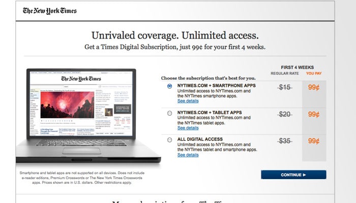 Toujours à la pointe de l’innovation et de la recherche d’un modèle économique viable pour la presse à l’heure d’Internet, le New York Times a ouvert la voie en instaurant son « paywall » (système de monétisation au compteur) en mars 2011 : l’internaute peut consulter gratuitement jusqu’à 20 articles par mois, au-delà de quoi il doit s’abonner et payer. Depuis avril 2012, le NYT a ajusté son tir et ramené le nombre d’articles gratuits à 10.