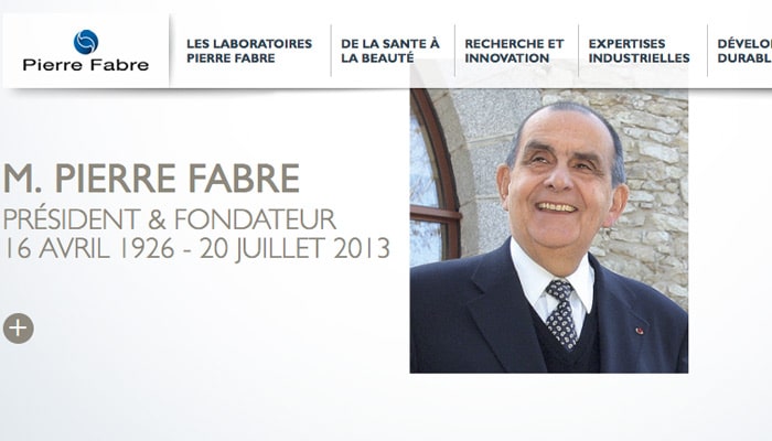 Âgé de 87 ans, Pierre Fabre est mort à son domicile de Lavaur, dans le Tarn, des suites d’une longue maladie. Dans les années cinquante, pharmacien à Castres, sa ville natale, Pierre Fabre invente le premier veinotonique contre les jambes lourdes, à base de houx. Devant le succès de ce produit (le « Cyclo 3 », encore commercialisé), il crée en 1962 le laboratoire Fabre, rachète des marques (Klorane, Ducray, René Furtherer…) et ressuscite l’eau thermale d’Avène en 1990 en lançant une gamme du même nom. Le laboratoire Fabre est aujourd’hui le troisième laboratoire pharmaceutique français après Sanofi et Servier avec un chiffre d’affaire en 2012 de près de 2 milliards d’euros et 10 000 salariés employés, dont 6700 en France.