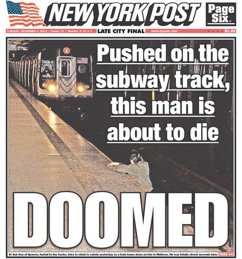 « Condamné » titre le journal, dont le propriétaire n’est autre que le groupe News Corp. « Poussé sur la voie, cet homme va mourir », sous-titre-t-il. Agressé puis poussé sur les rails par un clochard d’une trentaine d’années, Ki Suk Han, 58 ans, n’a en effet pas réussi à remonter sur le quai avant l’entrée du métro en station et est mort des suites de la collision. Une telle Une n’a laissé personne indifférent : les médias doivent-ils tout montrer ? Le photographe, R. Omar Abbasi, au lieu de photographier la scène, n’aurait-il pas pu essayer d’aider le malheureux à remonter sur le quai ?