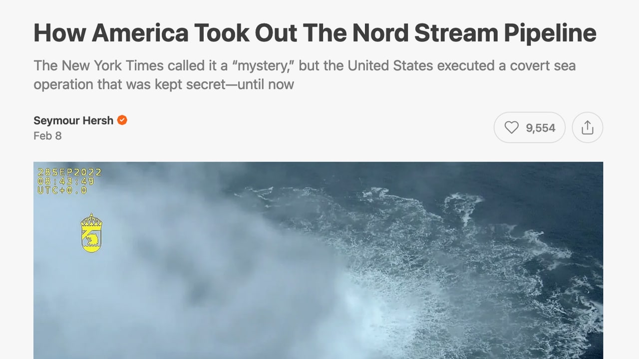 Après une longue enquête à la Albert Londres, Hersh publie un long article (traduction française à télécharger ici) sur le sabotage de Nord Stream jusqu’ici inexpliqué, les Russes accusant les États-Unis, les Américains accusant les Russes qui auraient détruit leurs propres gazoducs. Il n’est pas nécessaire de souligner l’importance extrême de ces installations pour l’économie allemande et ses sources d’approvisionnement en énergie.