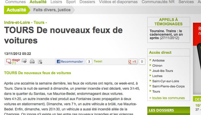 Un de nos observateurs de terrain nous signale un flagrant délit. Les voitures brûlées deviennent tellement quotidiennes que la préfecture de Paris a préféré ne plus publier de statistiques sur ce sujet (casser le thermomètre fait baisser la fièvre, c’est bien connu). Et en province ? Dans son édition du lundi 13 novembre 2012 (Tours et agglomération) La Nouvelle République parle de « feux de voitures ». Notre observateur commente : « Ces voitures s’enflamment sans doute toutes seules. »