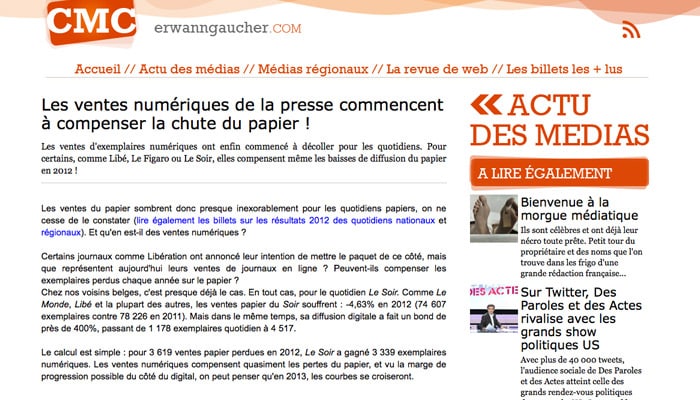 « Que représentent aujourd’hui [les] ventes de journaux en ligne ? Peuvent-ils compenser les exemplaires perdus chaque année sur le papier ? » Ce sont les deux questions auxquelles le journaliste Erwann Gaucher répond, chiffres à l’appui, sur son site internet.