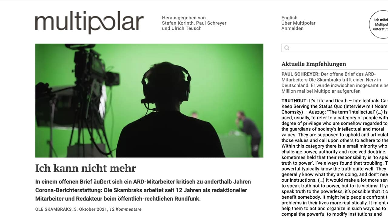 Pendant longtemps, j’ai pu dire avec fierté et joie que je travaille pour le radiodiffuseur de service public. Beaucoup de recherches, de formats et de contenus exceptionnels proviennent d’ARD, de ZDF et de Deutschlandradio. Les normes de qualité sont extrêmement élevées et des milliers d’employés font un excellent travail, même sous une pression accrue sur les coûts et des objectifs d’économies. Mais quelque chose s’est mal passé avec le corona. Soudain, je perçois une vision style tunnel et des œillères et un consensus supposé qui n’est plus remis en cause.