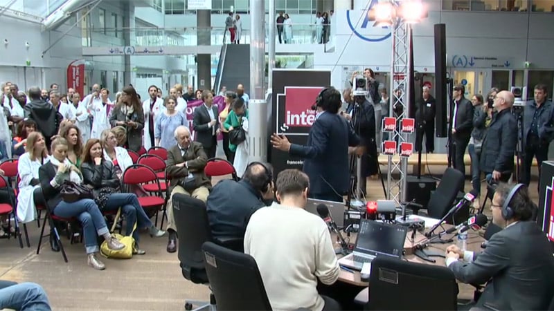 Il est 8h20 ce 29 mai lorsque Mar­tin Hirsch, directeur de l’AP-HP (75 000 agents, 7 mil­lions de patients par an en région parisi­enne, Oise et Var), est inter­rogé en direct dans les locaux de l’Hôpi­tal Pom­pi­dou. Alors qu’il débite un dis­cours ras­sur­ant à l’an­tenne, son per­son­nel révolté pour divers­es raisons bien plus pro­fondes que le seul sujet de l’or­gan­i­sa­tion du temps du tra­vail (rythmes de tra­vail épuisant, moyens en baisse, réor­gan­i­sa­tions de ser­vice bâclées…) le chahute à l’an­tenne. La voix du peu­ple envahit l’e­space sonore, cou­vrant le patron de l’AP-HP qui con­tin­ue à dis­courir, presque décon­nec­té : “celles et ceux dont on entend les clameurs aujour­d’hui et moi, nous avons vrai­ment le même souci”.