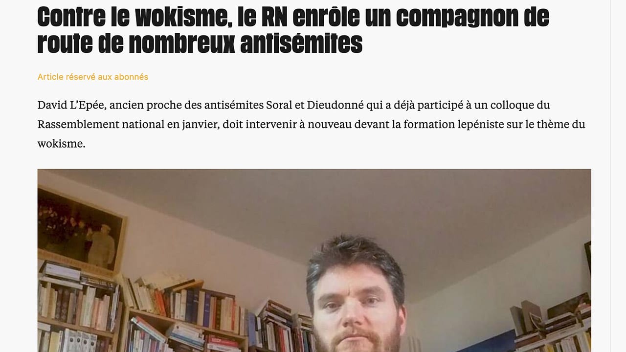 Dans un article du 13 avril 2023, le trio habituel de ce que nous pouvons appeler les professionnels du journalisme de délation, Pierre Plottu, Maxime Macé et Nicolas Massol ont attaqué le journaliste suisse. Le prétexte en était la participation de David L’Épée à un colloque organisé contre le wokisme le 21 avril par le groupe ID du Parlement européen dont le RN fait partie.