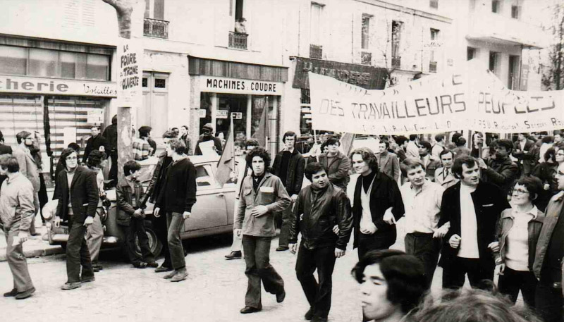 1er mai 1972 : En tête du cortège, on reconnaît, de gauche à droite : Alain Geismar (porte-parole de l’ex-Gauche Prolétarienne, blouson en cuir noir), Nicolas Baby (AMR, veste noire, gilet blanc), Arlette Laguiller (Lutte Ouvrière).