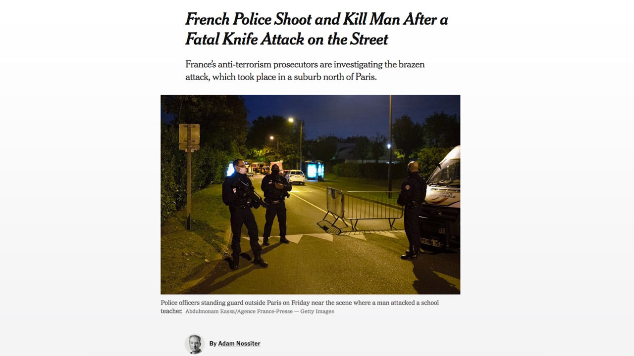 “French police shoot and kill man after a knife attack on the street” (titre original de l’article, modifié à plusieurs reprises depuis par le New York Times) : « La police française tire et tue un homme après une attaque au couteau dans la rue »