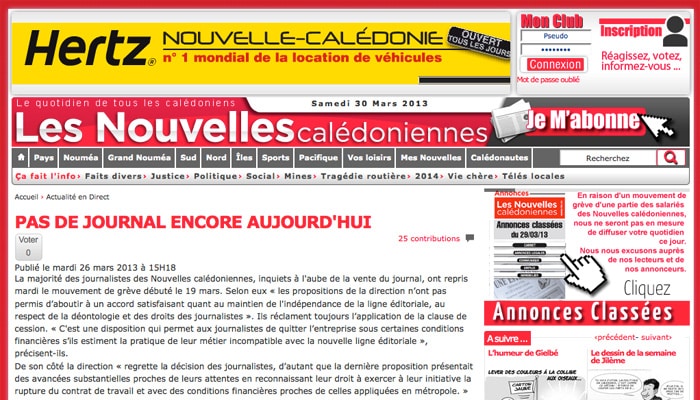Une nouvelle épine dans le pied de Bernard Tapie. L’homme d’affaires croyait pouvoir vendre tranquillement le quotidien Les Nouvelles calédoniennes, acheté en même temps que les autres titres du groupe Hersant, à un « investisseur local ». Raté ! Les journalistes, craignant pour leur indépendance, se sont mis en grève.