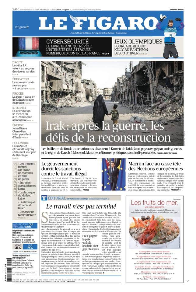Mardi 13 février 2018, Le Figaro poursuit son analyse, et son soutien attentif, à la politique du président et du gouvernement, deux des titres principaux concernant cette politique, en particulier au sujet de l’Europe. Cependant, le titre principal s’intéresse à la situation de l’Irak d’après-guerre, et même d’après trois conflits, auxquels s’est ajouté la présence de l’EI.