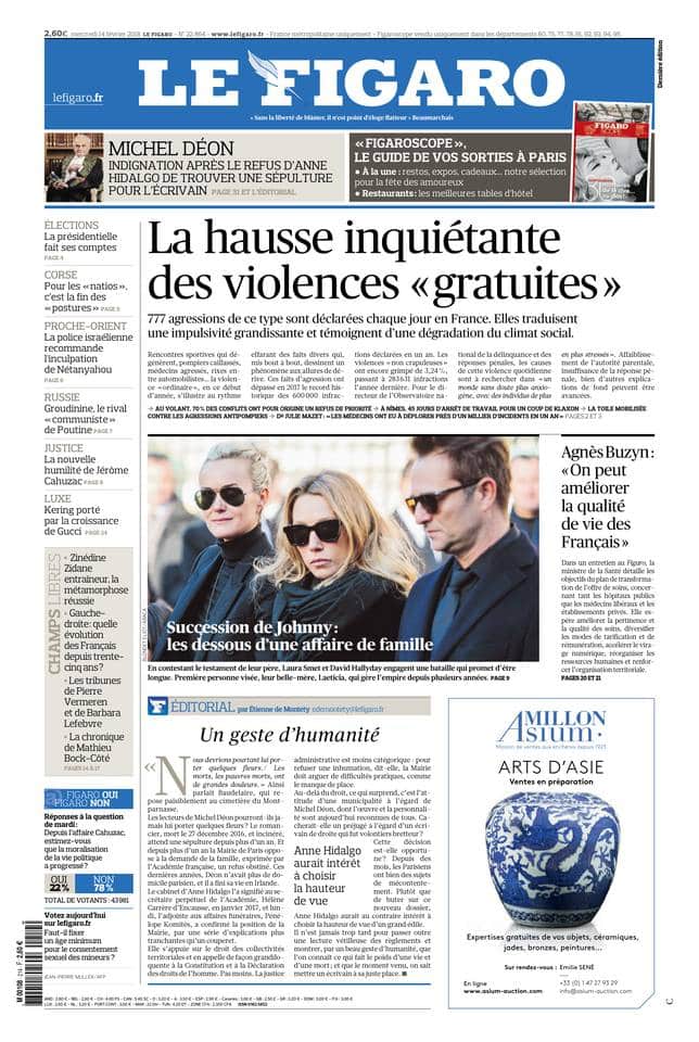 Mercredi 14 février, Le Figaro n’est pas influencé par la saint Valentin, titrant en partie sur la succession du chanteur Johnny Halliday, succession venant rappeler à propos et aux naïfs le poids de l’argent dans les relations humaines. La Une présente cependant deux titres principaux.