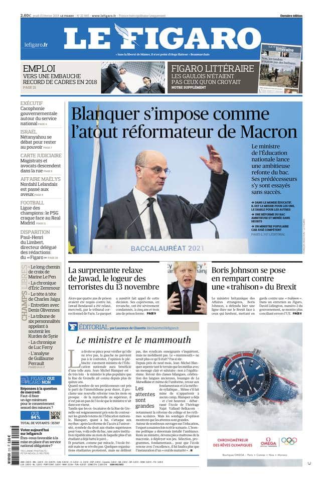 Jeudi 15 février 2018, l’un des titres de la Une trouve « surprenante » la relaxe de Jawad Bendaoud, ressortissant de Seine Saint Denis connu pour avoir « logé » les terroristes du 13 novembre. Le quotidien est surpris de voir une personne ayant un tel parcours judiciaire, délictueux et criminel, être pris au sérieux quand il prétend n’avoir rien à voir avec les tueur. Le principal titre porte cependant sur la réforme du Baccalauréat, chantier d’envergure mené par le ministre Blanquer.