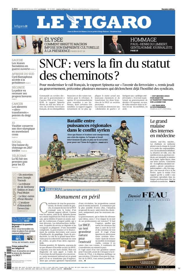 Vendredi 16 février 2018, la boucle est bouclée. Dans la foulée des annonces gouvernementales Le Figaro évoque le gros titre un sujet qui risque fort de fâcher : la possible « fin du statut des cheminots ».