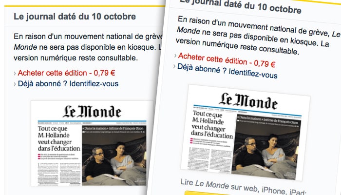 Vous n’avez pas trouvé Le Monde daté du 10 octobre « en raison d’un mouvement national de grève, Le Monde ne sera pas disponible en kiosque » (communiqué du monde.fr du 9 octobre 2012. D’ailleurs vous n’aviez pas trouvé le même journal il y a deux semaines le jour du Monde des livres. Mais vous ne trouverez pas plus Le Figaro ou Libération le mercredi 10 octobre car Presstalis est de nouveau en grève.