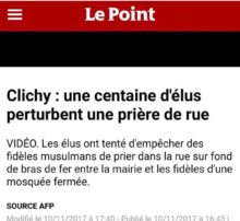 Les prières de rue de Clichy : le 10 novembre 2017, l’AFP démarre en trombe et en trompe‑l’œil par une dépêche : « Une centaine d’élus en écharpe ont tenté vendredi 10 novembre à Clichy (Hauts-de-Seine) d’empêcher des fidèles musulmans de faire leur prière dans la rue ». Rien de contestable, la phrase est factuelle. Elle ouvre cependant la porte à la façon dont la dépêche va être reprise par une partie des médias, dans la journée. Le verbe « empêcher » étant rapidement remplacé par le verbe en partie synonyme « perturber ». Ainsi, Le Point :