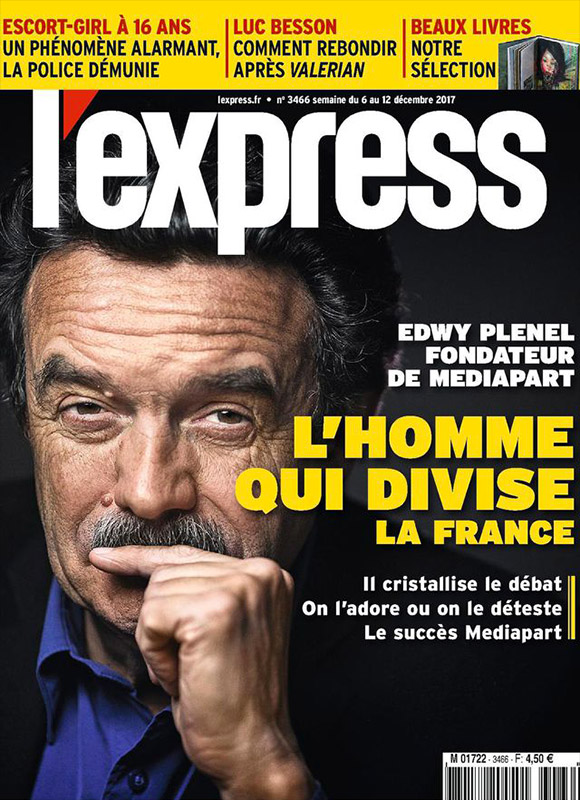 Dans son édition datée du 6 au 12 décembre 2017, L’Express titre donc sur « Edwy Plenel fondateur de Médiapart. L’homme qui divise la France. Il cristallise le débat. On l’adore ou on le déteste. Le succès Médiapart ».