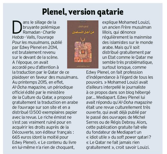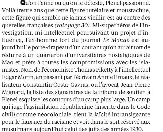 Le journaliste conclut en laissant entendre une probabilité : Edwy Plenel est avant tout mené par son ego. Le dossier se prolonge avec un article sur la « guerre » entre Valls et Plenel, puis un entretien avec Benjamin Stora qui « connaît bien le fondateur de Médiapart ». Pour l’historien, Plenel « a toujours été contre tous les racismes ». Stora endosse le costume de l’avocat de Plenel. Celui de l’accusateur est confié à Pierre-André Taguieff pour qui Plenel « n’explique pas, il prêche et dénonce ». Taguieff « fut ami avec Plenel avant de prendre ses distances ». Il est vrai que le politologue s’est retrouvé à la Une du Monde de Plenel, dans le cadre de ce qu’il décrit ainsi :