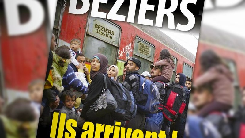 Dans le dernier numéro du journal municipal, la couverture montre en effet une photo de Robert Atanasovski, où l’on voit des clandestins devant un train. Le journal titre « Ils arrivent » et sur les fenêtres du train, on peut voir des inscriptions rajoutées au montage telles que « Béziers : 3865 km » et « Scolarité gratuite, hébergements et allocations pour tous ».