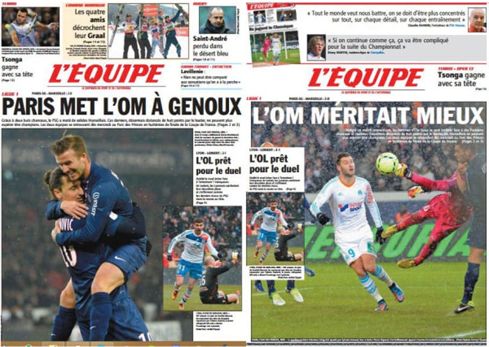 Après la victoire du Paris Saint-Germain sur l’Olympique de Marseille ce dimanche, L’Équipe titrait, pour ses journaux mis en vente dans la capitale : « Paris met l’OM à genoux ». Pour ceux vendus à Marseille, la Une est légèrement plus douce : « Marseille méritait mieux ». Si le contenu du journal est identique, c’est bel et bien deux Unes différentes qui se sont retrouvées à Paris et à Marseille le lendemain de la rencontre. On recense même une version lyonnaise, mettant en avant un tout autre sujet : la victoire de l’Olympique Lyonnais.