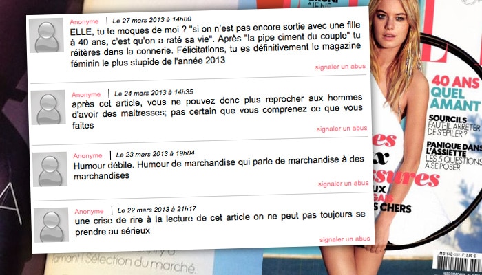 Dans un dossier intitulé « 40 ans, quel amant ? », le magazine féminin, véritable bible du savoir-vivre pour ses lectrices, fait la promotion de l’adultère et du lesbianisme. « Si on n’est pas encore sortie avec une fille à 40 ans, c’est qu’on a raté sa vie », écrit l’auteur. Pour Elle, tromper son mari est déjà une bonne chose pour pimenter sa vie sexuelle. Mais s’il s’agit d’une amante, c’est encore mieux ! Cela assure « une énorme crédibilité swag (ndlr : tendance) » et permet d’être « au cœur de l’action et des débats qui agitent la société » en plein débat sur le « Mariage pour tous ».