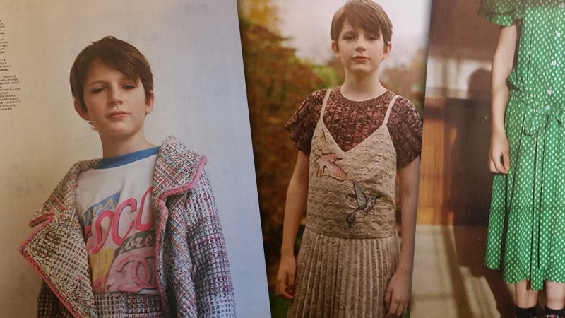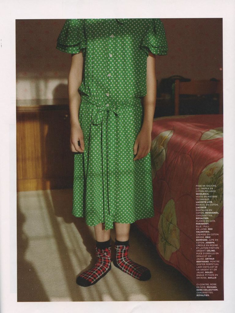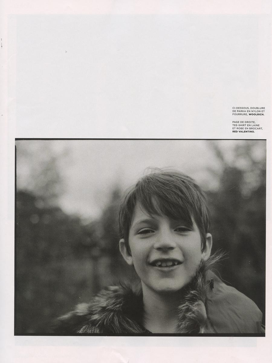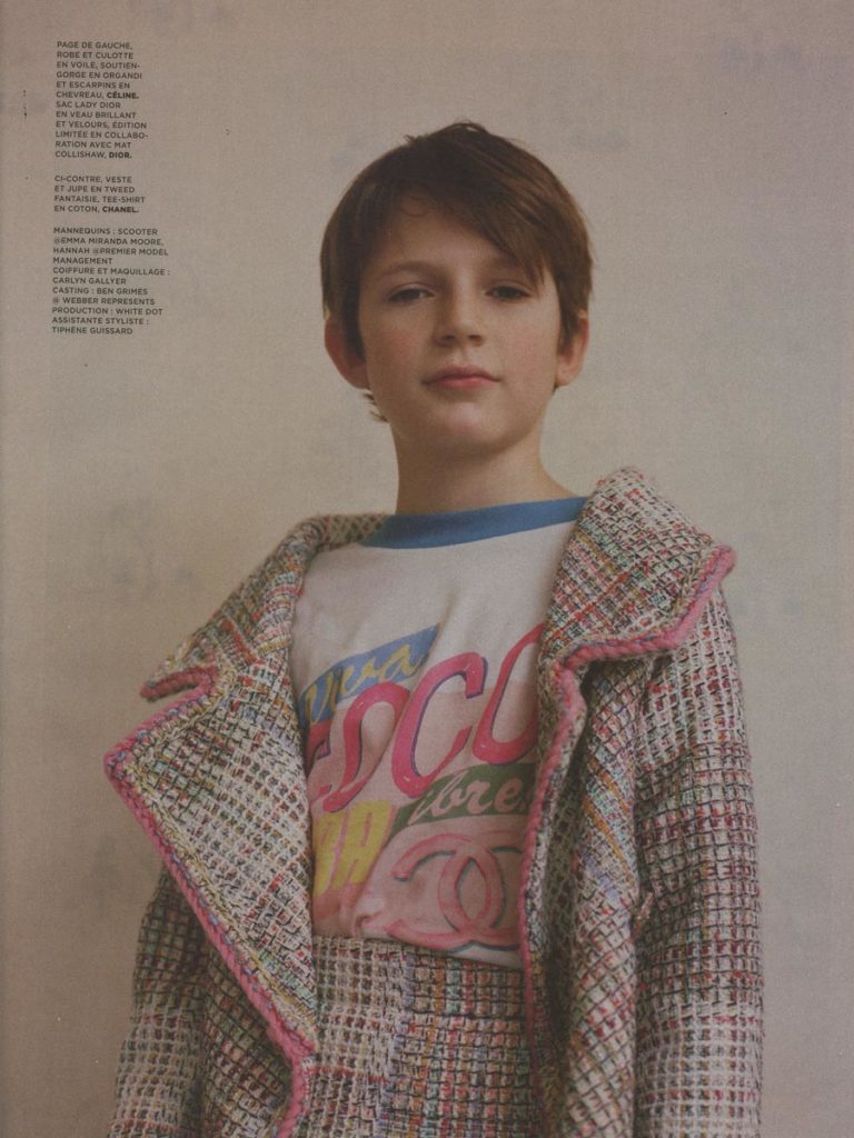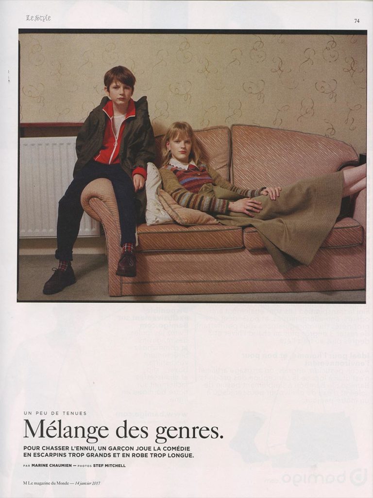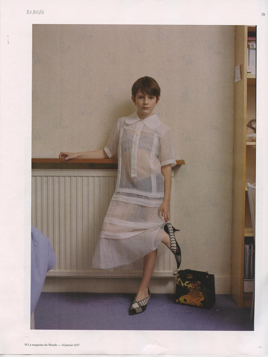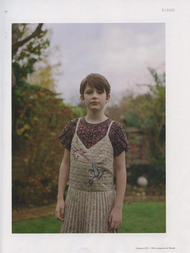 Qu’y voit on ? Un reportage photographique de mode, Chanel, Dior, Bompard, Lacoste, rien que de très classique et très cher comme le veut la cible du supplément du Monde du week-end qui est un média à visée publicitaire pour les CSP+. Les modèles sont des enfants ; pourquoi pas, les CSP+ sont disposés à dépenser pour leurs chers petits. Beaucoup plus intéressant, le petit garçon (neuf/dix ans) est habillé en fille. « Veste et jupe en tweed fantaisie, tee shirt en coton, Chanel ». Sur une autre photo le même garçon porte une espèce de haut plutôt informe avec une robe à bretelles plissée avec de petits oiseaux. C’est une image performative : bobos qui lisez Le Monde, habillez vos garçons en filles, mettez leur des jupes et des robes, dévirilisez les au maximum, qu’il ne reste rien sinon la confusion des genres.