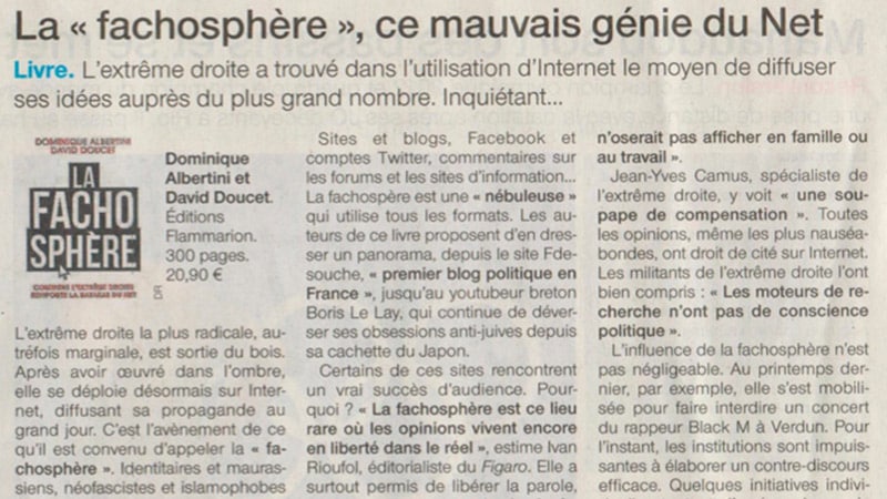 Revenant sur La Fachosphère, le dernier livre de Dominique Albertini et David Doucet, le journaliste estime que grâce à internet, « l’extrême-droite la plus radicale, autrefois marginale, est sortie du bois » pour diffuser sa « propagande au grand jour ». Ainsi, sur la toile, se retrouvent les « identitaires, maurassiens, néofascistes et islamophobes ».