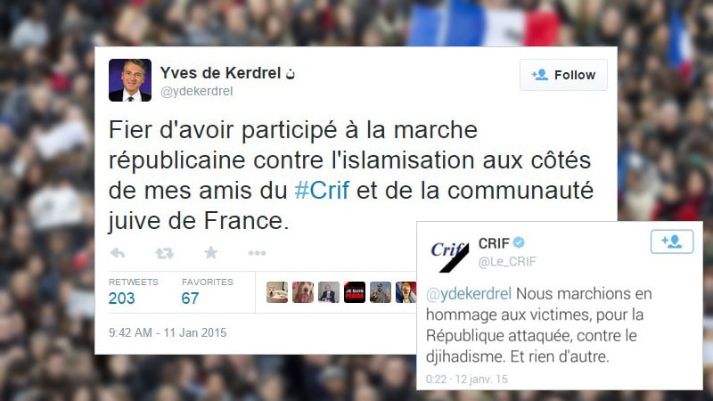 Un ami dont le Con­seil représen­tatif des insti­tu­tions juives de France se serait d’ailleurs bien passé… Après avoir par­ticipé à la « marche répub­li­caine » ce dimanche, le patron de Valeurs Actuelles s’est dit, sur son compte Twit­ter, « fier d’avoir par­ticipé à la marche répub­li­caine con­tre l’is­lami­sa­tion aux côté de (ses) amis du Crif et de la com­mu­nauté juive de France ». Un tweet qui a depuis été effacé mais cap­turé par des inter­nautes vig­i­lants.