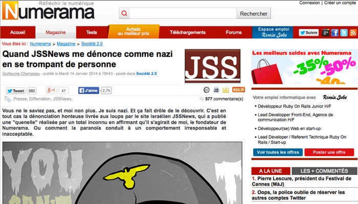 Problème : dans sa chasse aveugle à ceux qu’il appelle volontiers des « nazillons », JSS News a commis une bourde en publiant à tort les informations de Guillaume Champeau, fondateur du site Numérama, alors que celui-ci n’était pas la personne figurant sur la photo publiée en dessous de son nom et n’a même jamais fait la moindre quenelle.