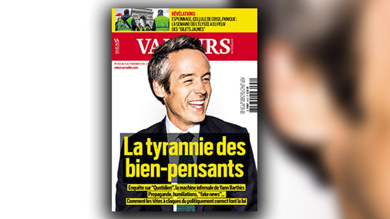 Le numéro de l’hebdomadaire Valeurs Actuelles daté du 21 au 27 novembre aurait dû, comme il est d’usage, être découvert par ses lecteurs potentiels en kiosques ou maisons de la presse au petit matin du jeudi 21 novembre. Ce ne fut pas le cas. Pourquoi ? L’un des « héros » du pouvoir médiatique bien-pensant, devenu celui des « rien pensants » selon l’excellente formule d’Elisabeth Lévy, a décidé de le pirater et de le mettre à disposition de tout un chacun dès le mercredi soir, dans le cadre de son émission ainsi que sur les réseaux sociaux. Ce soir-là, Yann Barthès a tenté de retourner une situation difficile à son avantage mais n’y est pas parvenu : il fait la couverture du numéro, avec comme titre « La tyrannie des bien-pensants », comme accroche « Enquête sur quotidien, la machine infernale de Yann Barthès. Propagande, humiliations, fake news… Comment les têtes à claques du politiquement correct font la loi ».