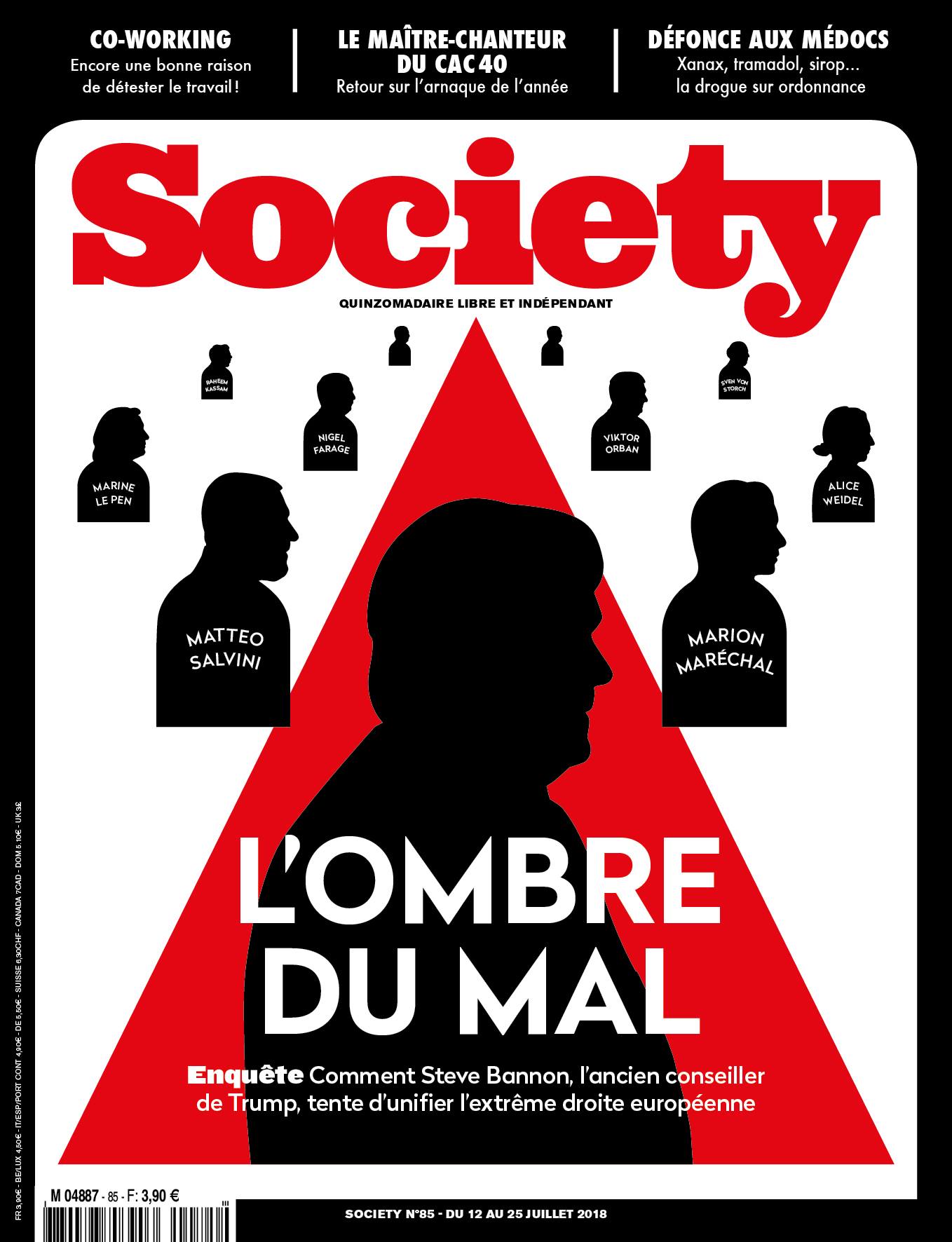Le dossier ne déroge pas non plus avec la couverture. Comme celle-ci l’indique, du point de vue de ce magazine, « L’ombre du Mal » plane. Un jeu de mot sur le « maléfique » complotiste, pourtant conception du monde généralement peu goûtée des médias libéraux libertaire, et sur « Mal/Mâle » en période de lutte féministe exacerbée. Le titre du dossier, dans les pages intérieures, ne lésine pas, confirmant que Society prend clairement un tournant politique militant : « Rance Europe Express » est-il asséné. L’accroche n’y va pas par quatre chemin au sujet de Steve Bannon qui, ayant « traversé l’Atlantique » souhaiterait faire quelque chose de « terrifiant » en Europe : « conseiller les nationalistes, un peu partout en Europe, pour renverser encore une fois la table ». Le reportage du magazine se déroule à Rome « alors que l’Italie tombait à son tour dans les mains des populistes ». Bannon apparaît ici comme un marionnettiste tirant les ficelles de la montée des nationalismes et du populisme, tout en étant comparé à un « parrain de la mafia ». Un peu de mépris de classe aussi quand Society assimile l’ancien conseiller du président des États-Unis à « une caricature d’américain débraillé ». Mais la vraie crainte réside dans les projets supposés de Steve Bannon, ainsi cette idée de « former 10 000 activistes » attachés à « l’inquiétante mission de défendre l’occident judéo-chrétien », une mission « inquiétante » pour Society qui autrefois, et même durant de récentes guerres, apparaissait pourtant comme une fabrique de héros. Steve Bannon vu par Society ? Cela donne ceci :
