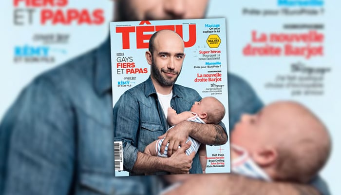 Le magazine Têtu, connu pour ses unes d’hommes nus au corps musclé et huilé, a affiché ce mois-ci en couverture un père homosexuel tenant son bébé dans les bras.