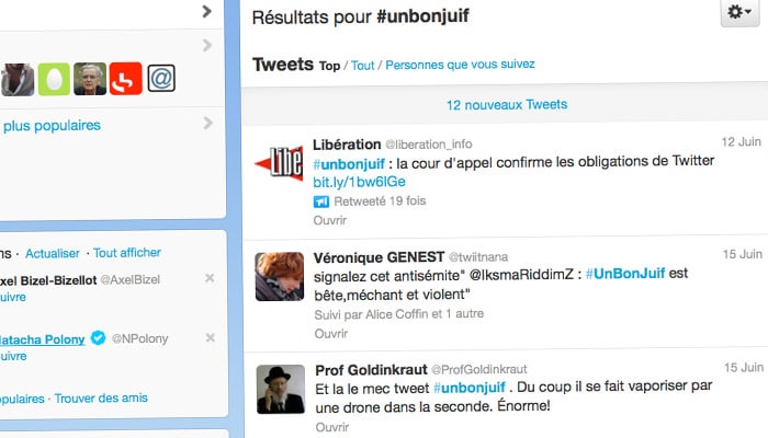 Twitter a été débouté le 12 juin par la cour d’appel de Paris dans l’affaire du hashtag #unbonjuif. La cour d’appel a confirmé son obligation de communiquer à cinq associations de défense des droits de l’homme les informations concernant les auteurs de tweets racistes ou antisémites.