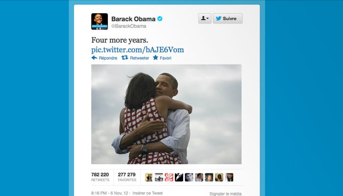 Une photo, et une légende. Trois mots : “Four more years”. Tout Twitter est là: 140 signes maximum, un format plus adapté à des chanteurs qui veulent entretenir le contact avec leurs fans qu’à la parole d’un président ? C’est pourtant ainsi qu’Obama a annoncé sa victoire, par ces trois mots (15 signes) accompagnant les photos d’un hug avec son épouse. Message qui a été retweeté 200.000 fois dans le quart d’heure qui a suivi. Une évolution car dans l’histoire (encore récente) de Twitter, les vedettes sont habituellement Lady Gaga ou le chanteur pour midinettes Justin Bieber (autour de 30 millions de followers chacun, contre un peu moins de 20 millions pour Obama).