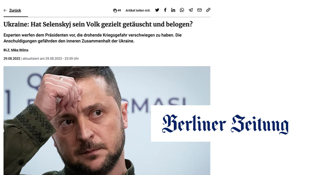 Le Berliner Zeitung est l’un des 3 principaux quotidiens régionaux de Berlin, fondé en 1945, à Berlin-est, idéologiquement de centre gauche. Il s’est illustré fin août 2022 en prenant un ton à revers de la majorité de la presse allemande sur le président ukrainien Zelensky, quasiment sanctifié de son vivant par les médias.