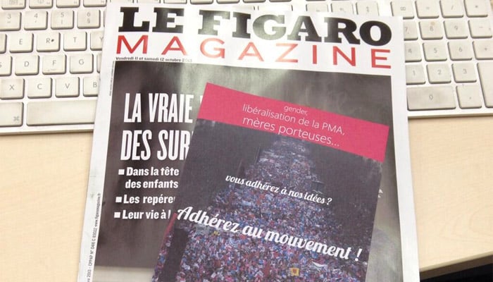 Dans Le Figaro Magazine de ce week-end, les lecteurs ont pu trouver un bulletin d’adhésion à la Manif pour Tous, le mouvement d’opposition à la loi ouvrant le mariage et l’adoption aux couples de même sexe.