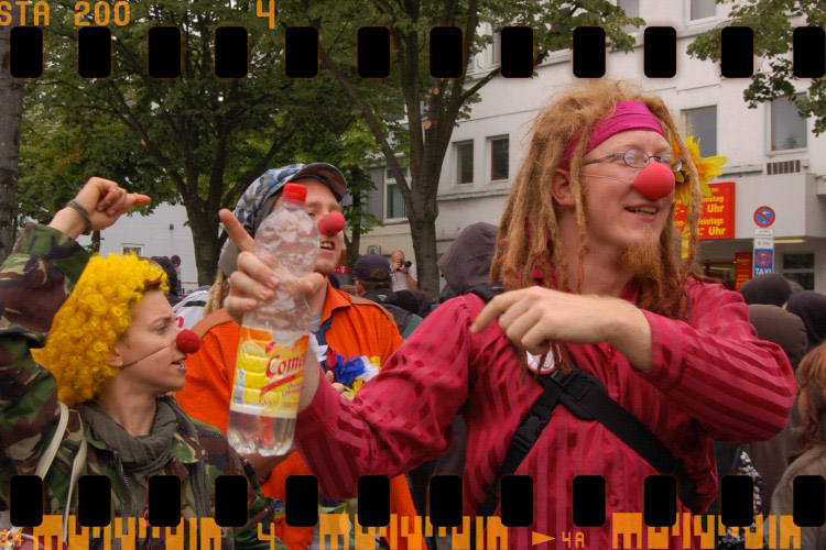 Entre temps, les deux acteurs – un homme et une femme d’une trentaine d’années – traversent le couloir en faisant la roue, pieds nus, vêtus de haillons multicolores et grimés en clowns larmoyant. Concentration, plein cadre.