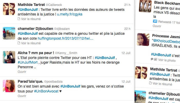 Une action qui intervient le lendemain de la décision du Tribunal de grande instance (TGI) de Paris, qui avait réclamé ces données. Les faits se sont produits en octobre 2012 quand des utilisateurs du réseau social avaient utilisé le hashtag « #unbonjuif » suivi d’un commentaire. L’UEJF avait aussitôt attaqué Twitter en justice, réclamant 38,5 millions d’euros.
