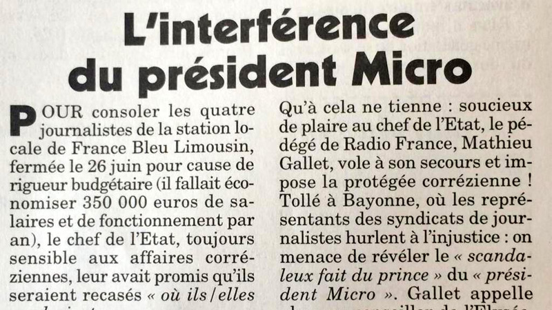 Selon Le Canard Enchaîné, François Hollande serait intervenu directement pour recaser une journaliste de France Bleu Limousin. Fermée le 26 juin pour cause de restrictions budgétaires, la station locale faisait vivre quatre journalistes auxquels le chef de l’État, « toujours sensible aux affaires corréziennes », aurait promis qu’ils seraient recasés « où ils/elles voulaient ».