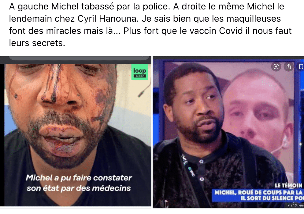 « À gauche Michel tabassé par la police. A droite le même Michel le lendemain chez Cyril Hanouna. Je sais bien que les maquilleuses font des miracles mais là… Plus fort que le vaccin Covid il nous faut leurs secrets ».